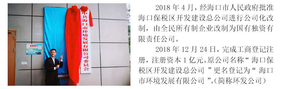 ??谑协h境發展有限公司是??谑袑賴歇氋Y有限責任公司,于2018年12月正式掛牌運營,注冊資本1億元,由1993年12月成立的??诒6悈^開發建設總公司進行公司化改制而成,核心業務為環境環衛產業投資和運營、資產運營和管理,培育業務為工程管理